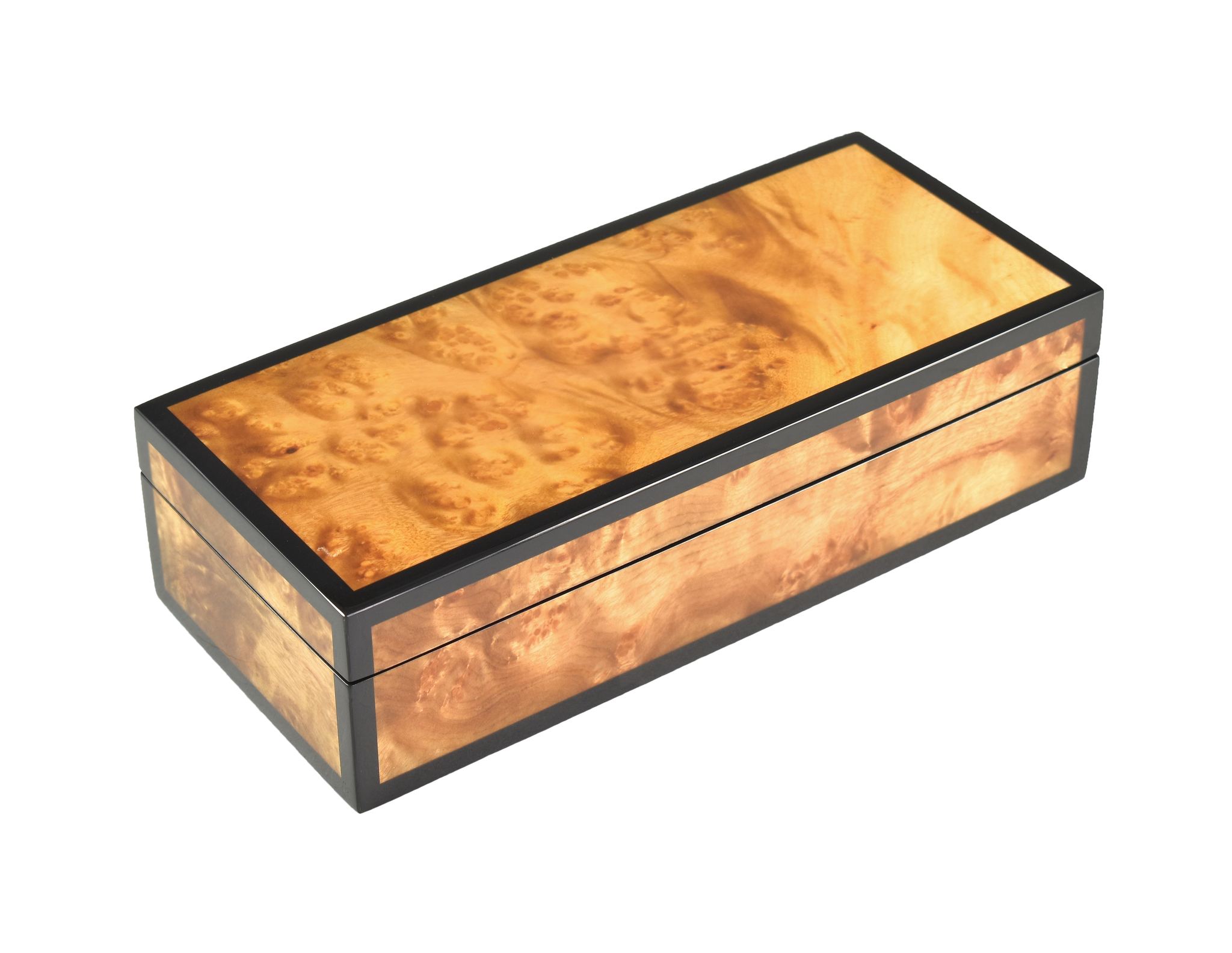 This walnut burl lacquered desk set makes for an ideal gift or a gorgeous display in your own home. Each high quality piece features a genuine wood inlay, black lacquered trim (and pencil cup inlay), velveteen lining (inside of accessories box only), and ships with a protective cloth cover. The set includes a pencil cup, accessories box, and footed tray.