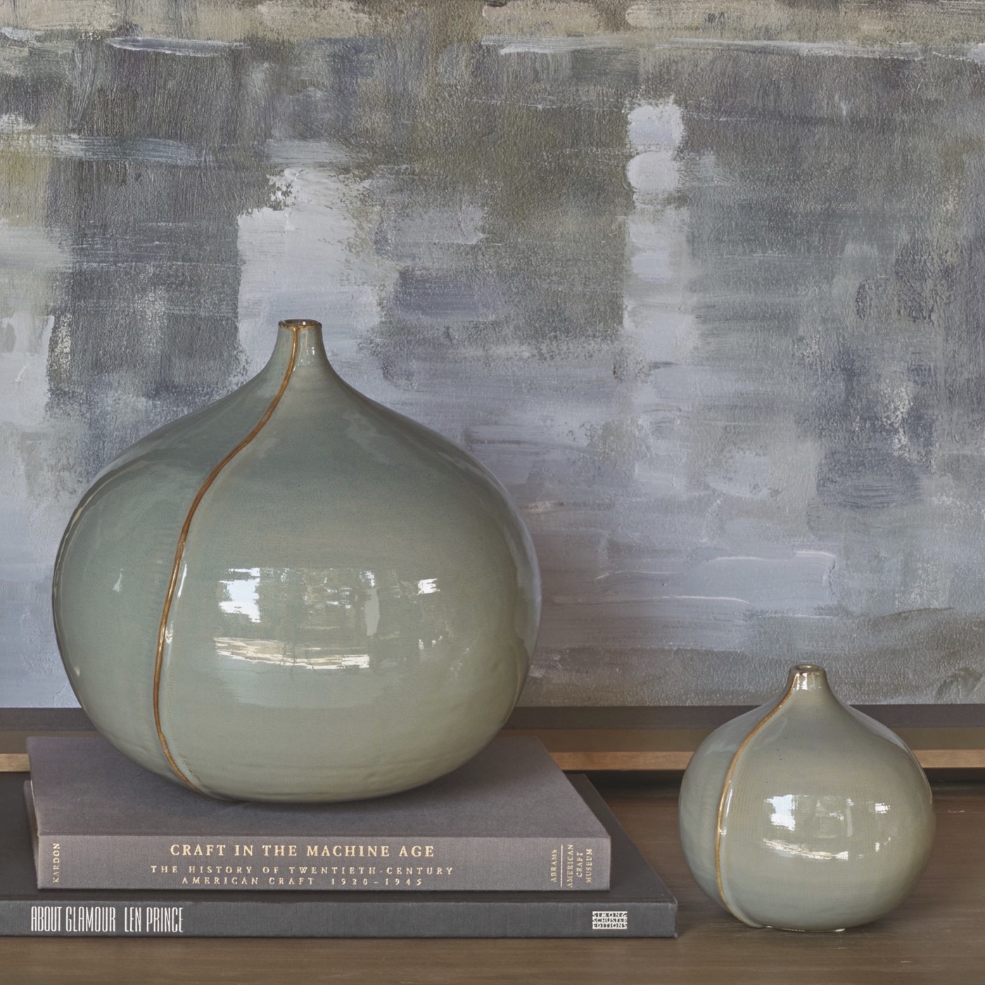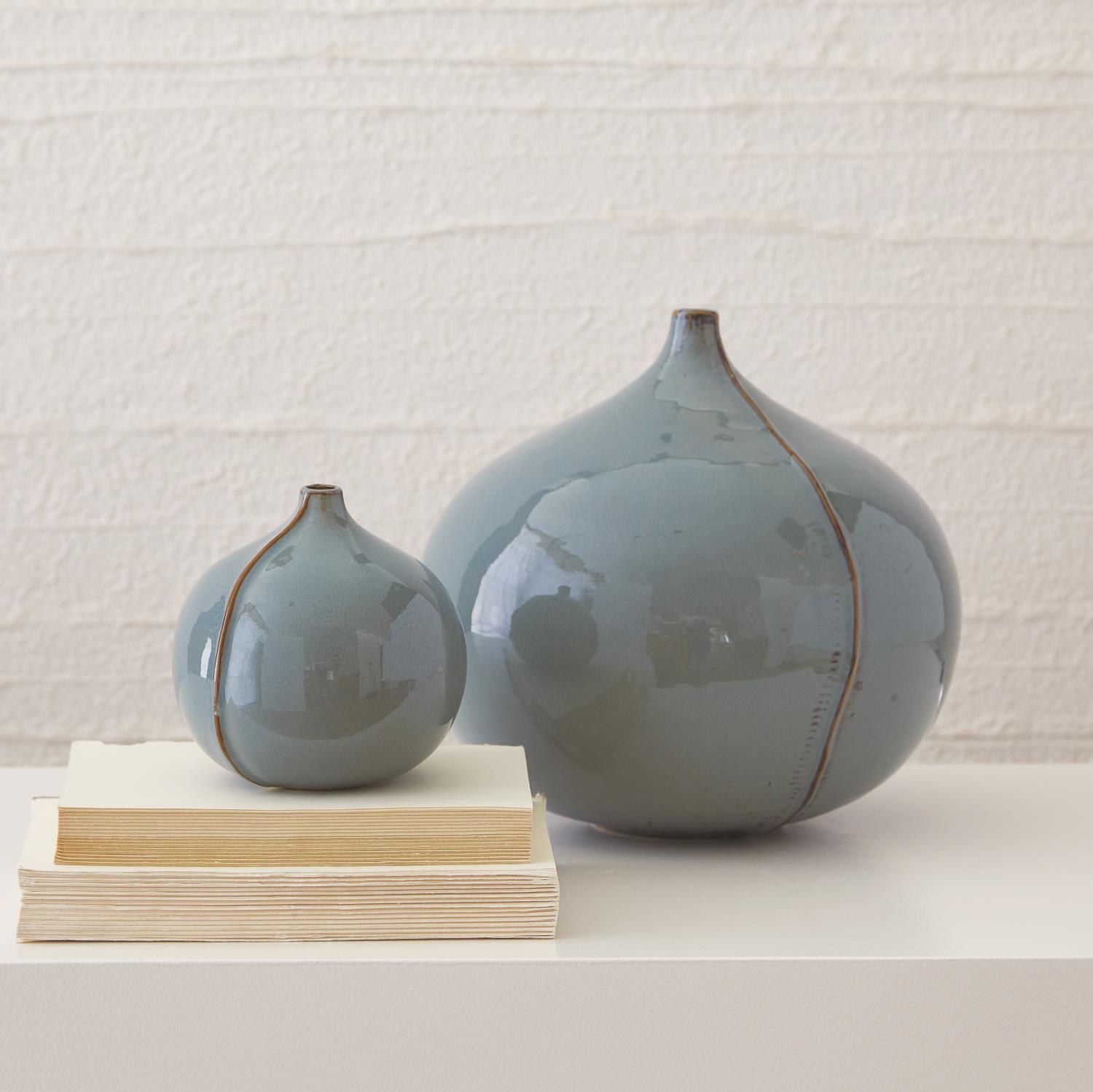 In a refreshing shade of light blue, these bulbous ceramic vases boast vertical overlapping edges that beautifully accentuate the alluring curves. Available in two sizes (shown left to right): small and large. Finish will vary.