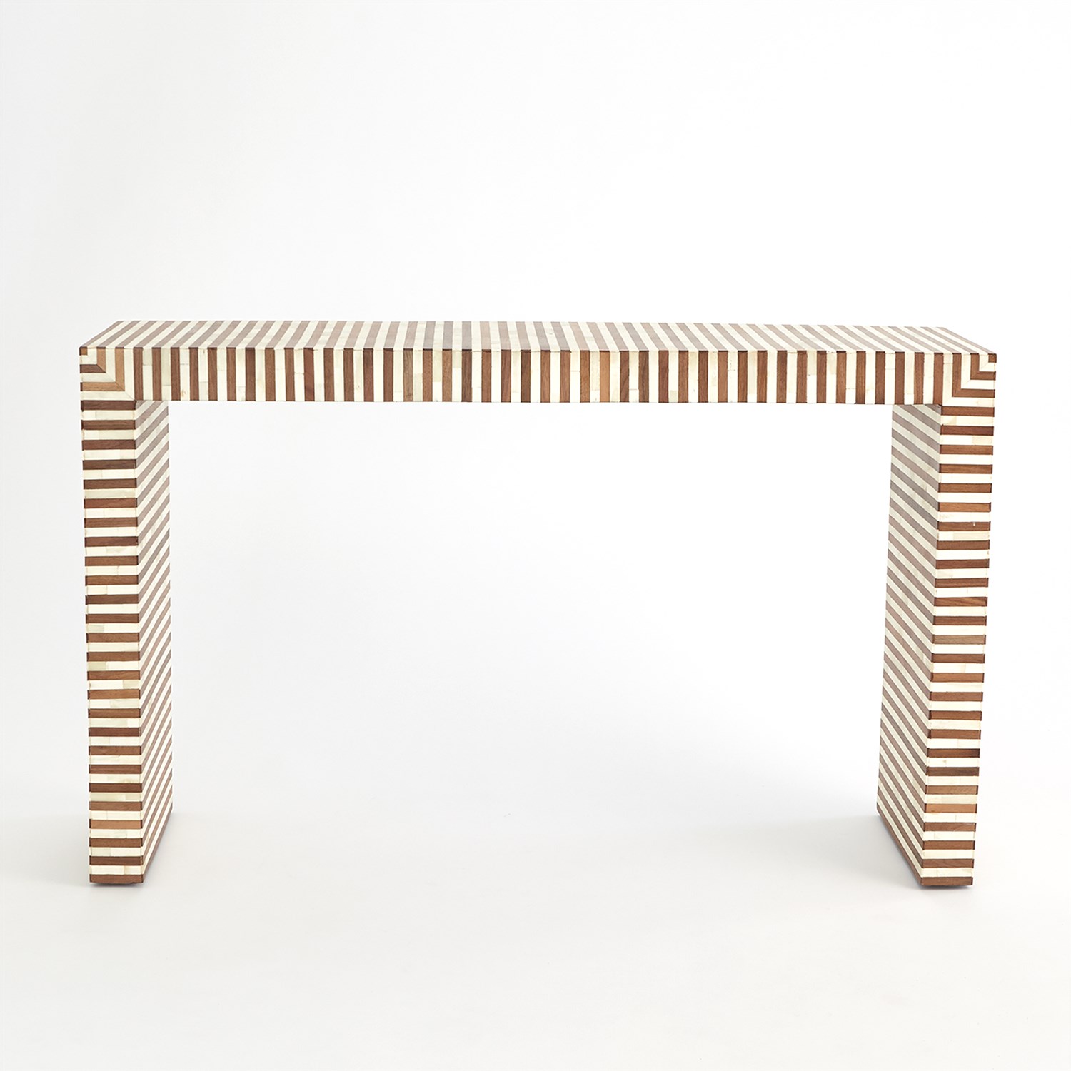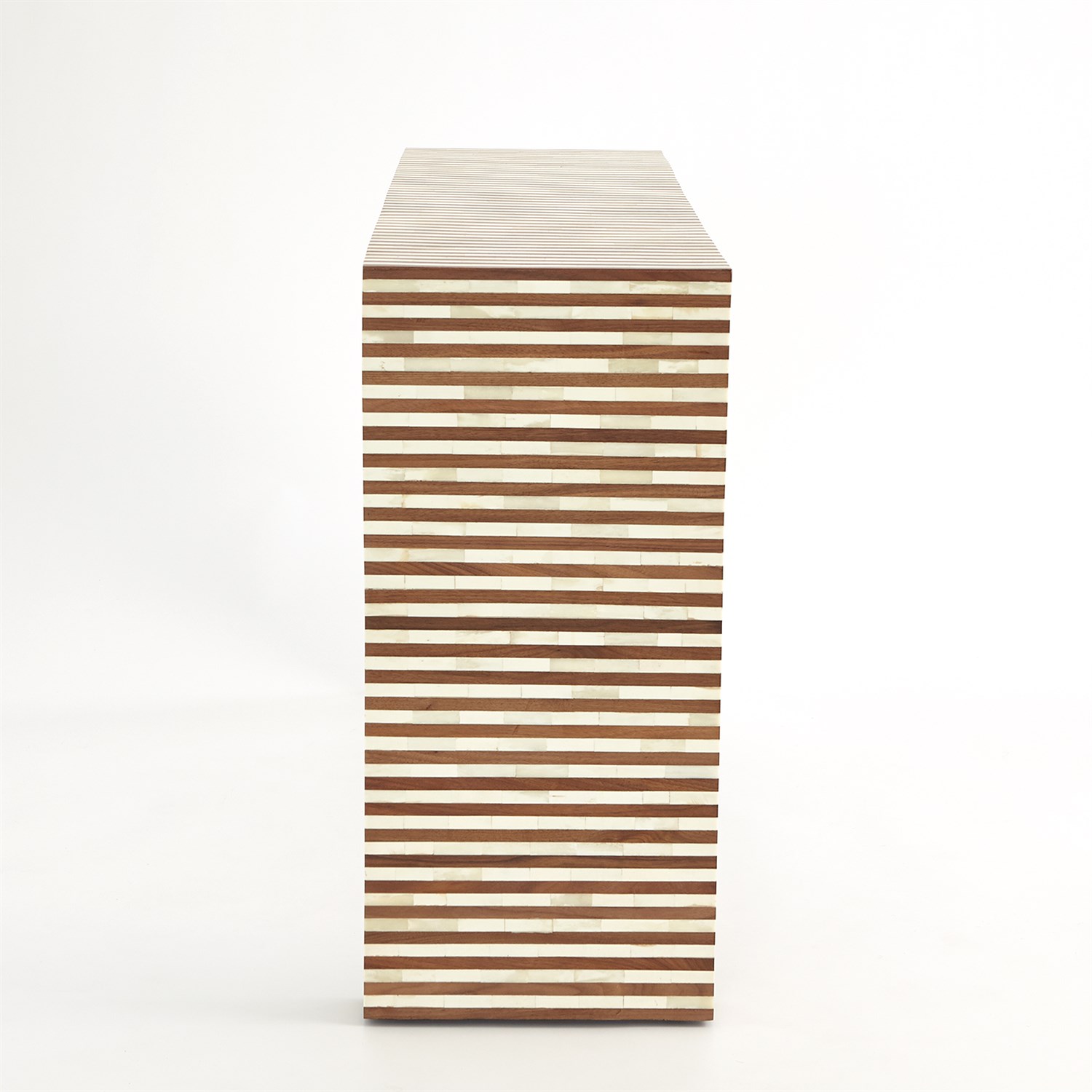 With its pattern of alternating walnut wood, bone, and mango wood, this handsome coffee table is sure to boldly impress in any space. Finished in a natural lacquer. Finish and natural colors will vary.