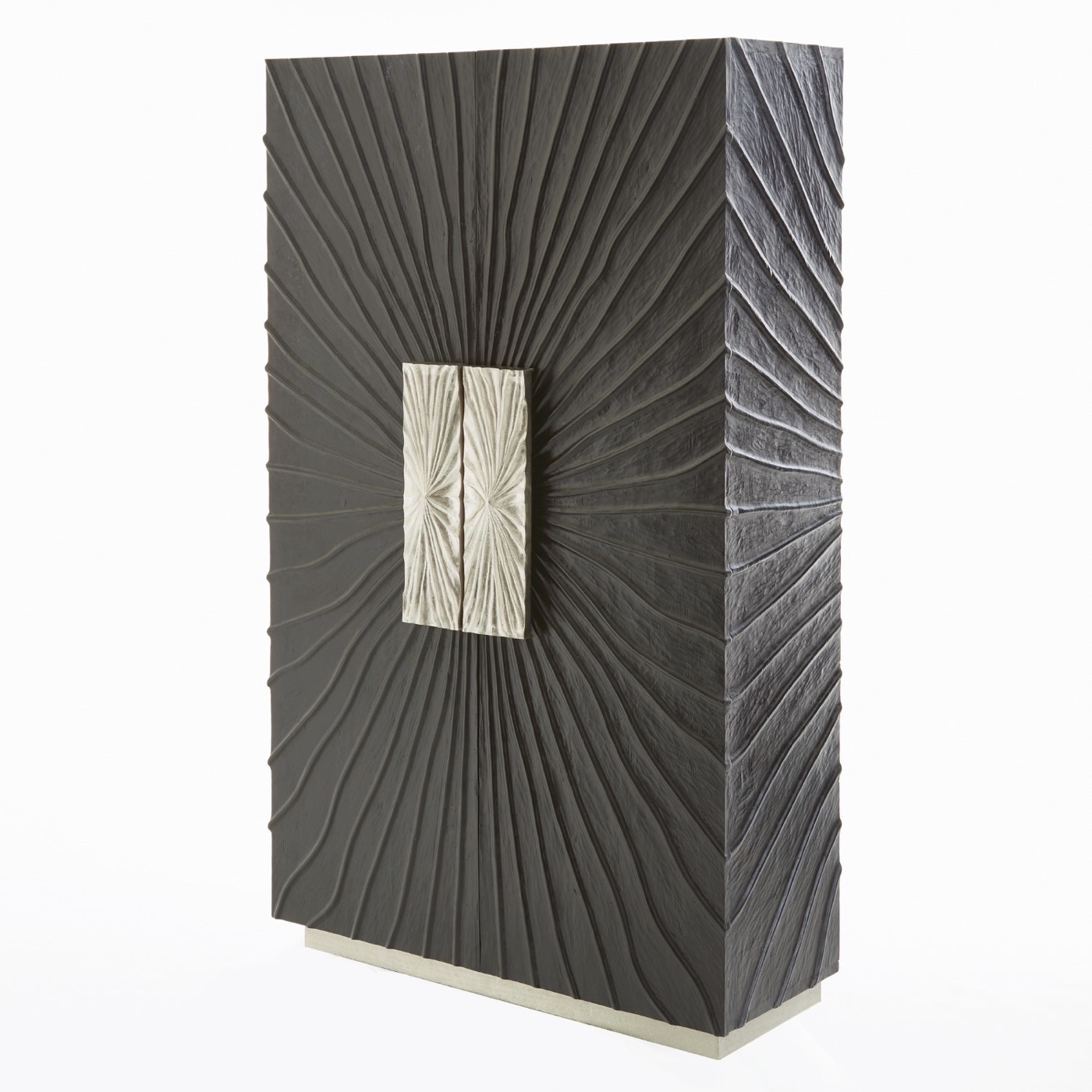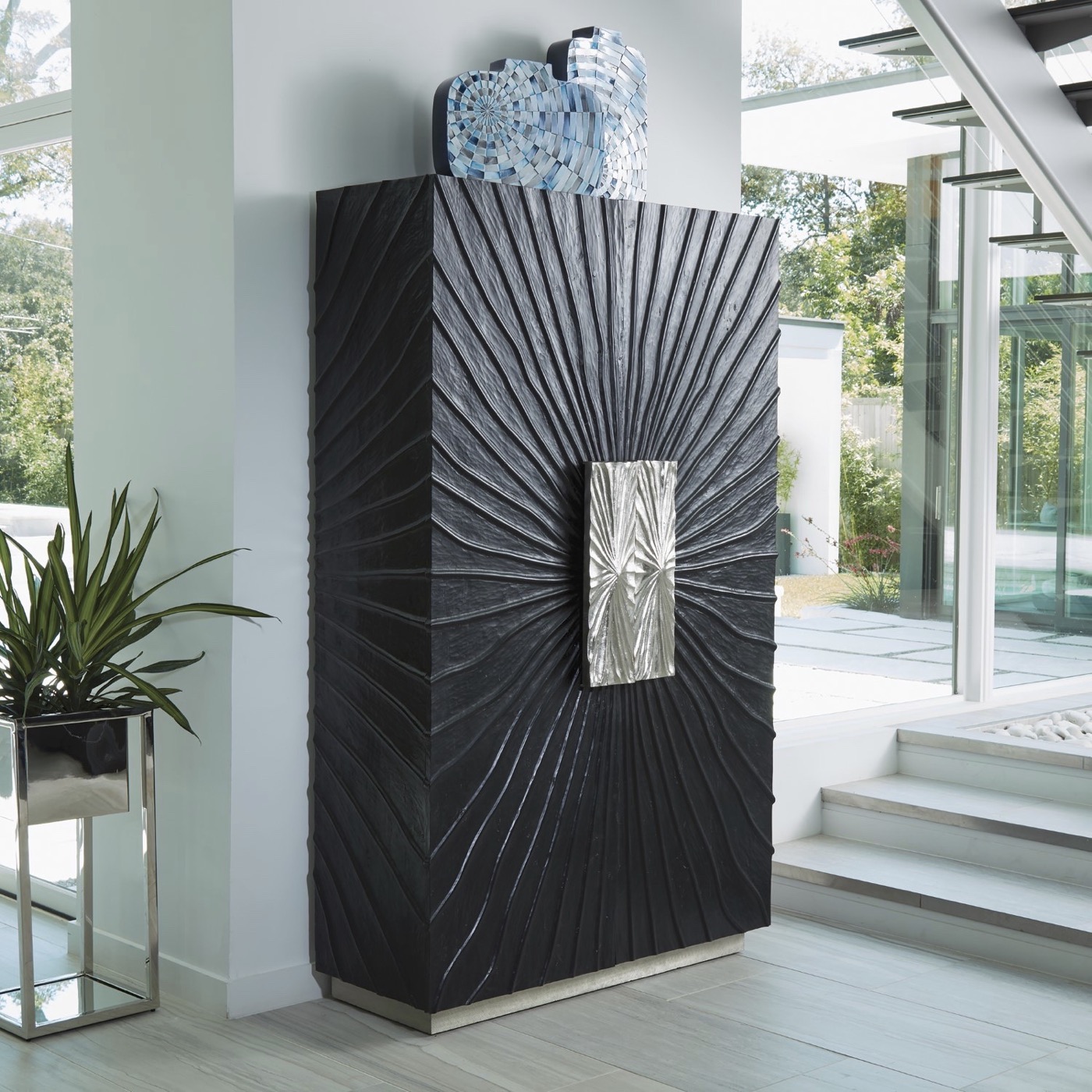 Vintage inspired in a sunburst motif, this textured pine wood armoire is a showstopper in its black finish and silver metal hardware and clad base. Inside the double doors, this cabinet features one fixed shelf on top, two adjustable glass shelves beneath, and three push-latch drawers for sleek storage under the lowest wood shelf. The mirrored back opens up the piece visually and lends an extra flare of refinement and glamor. Finish will vary.
